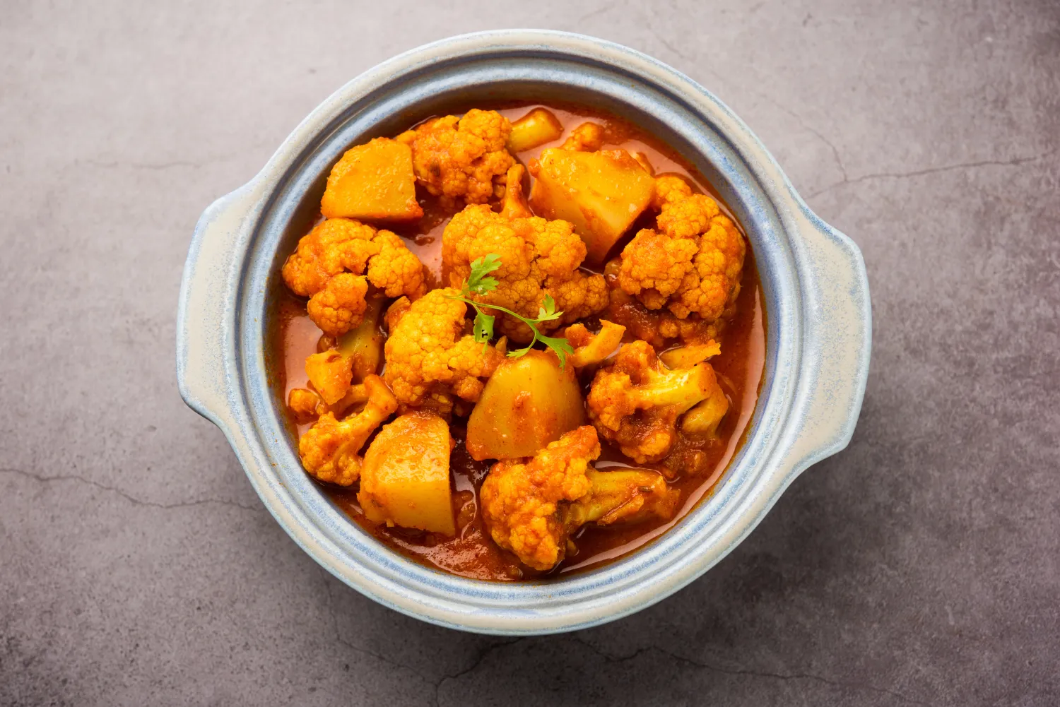A vegetarian dish made of cauliflower and potatoes, cooked with spices like turmeric, cumin, and coriander