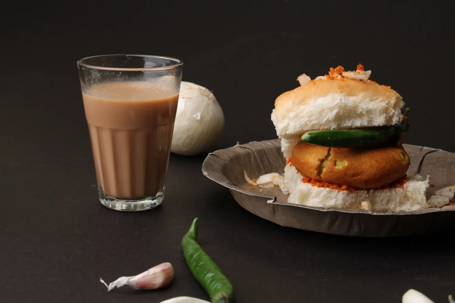 A popular vegetarian street food which consists of a deep-fried potato dumpling, served on a bun along with chutneys and spices.